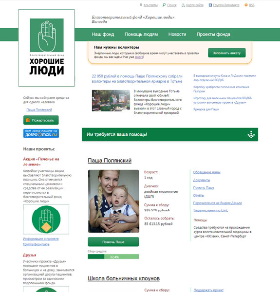 Благотворительный фонд «Хорошие люди» существует с 2012 года. Фонд объединил волонтеров и активистов Вологодской области, которые собирают деньги на лечение и медикаменты тяжелобольным людям.
